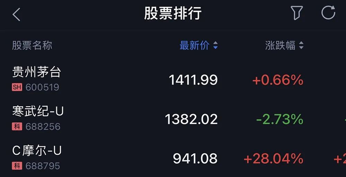 目前摩尔线程股价位居A股第三,仅次于贵州茅台(1411.99元/股)与寒武纪(1382.02元/股)。