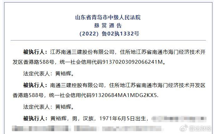 10月11日,青岛中院发布了针对南通三建、三建控股、黄裕辉等多人的悬赏通告,有效期至2026年10月10日。