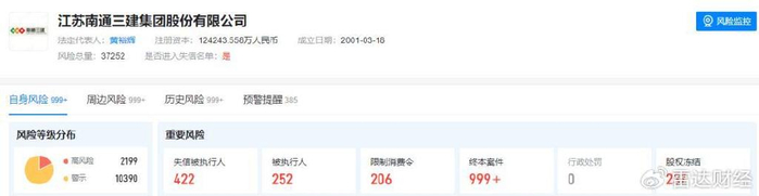 天眼查信息显示,截至目前,南通三建共有422条失信被执行人及237条股权冻结记录,涉限制消费令206条。