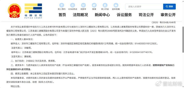据该公告,因被执行人深圳市江耀装饰工程有限公司、南通三建至今未履行深圳市中级人民法院民事判决书确定的义务,申请执行人江苏志吉新材料科技有限公司向法院申请向社会公开发布执行悬赏公告查找被执行人财产线索。
