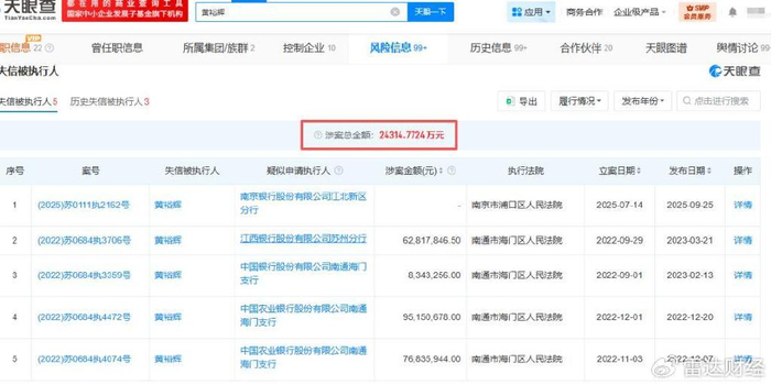 天眼查数据显示,截至目前,黄裕辉共存在5条失信被执行人记录,涉案总金额为2.43亿元。