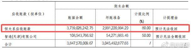 其中,恒大系应收账款高达37.39亿,因预计无法收回,公司计提坏账准备29.91亿元,计提比例高达80%。