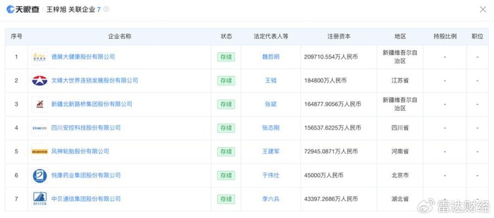 另据天眼查,有一位名为“王梓旭”的老板,其名下目前关联着德展健康、悦康药业、文峰股份等7家公司。