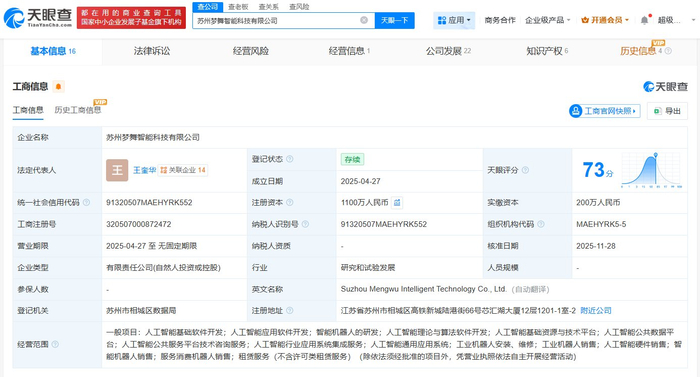 苏州梦舞智能科技有限公司成立于2025年4月,法定代表人为王奎华,经营范围包括人工智能基础软件开发、人工智能应用软件开发、智能机器人的研发、人工智能理论与算法软件开发等。股东信息显示,该公司由江苏长河投资有限公司、王奎华、牧牛生长股权投资(苏州)合伙企业(有限合伙)及上述新增股东等共同持股。