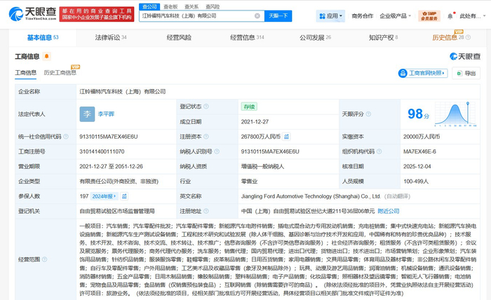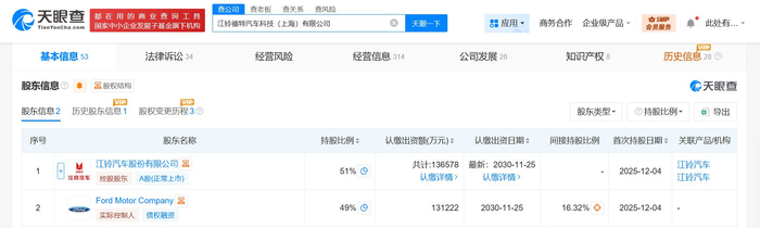 该公司成立于2021年12月,法定代表人为李平晖,经营范围含汽车销售、汽车零配件批发、汽车零配件零售、新能源汽车电附件销售、插电式混合动力专用发动机销售、充电桩销售、集中式快速充电站、新能源汽车换电设施销售、新能源汽车生产测试设备销售、工程和技术研究和试验发展等。股东信息显示,该公司由江铃汽车(000550)、Ford Motor Company分别持股51%、49%。