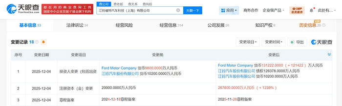 雷达财经讯,天眼查工商信息显示,近日,江铃福特汽车科技(上海)有限公司发生工商变更,注册资本由2亿人民币增至26.78亿人民币,增幅1239%。
