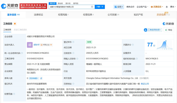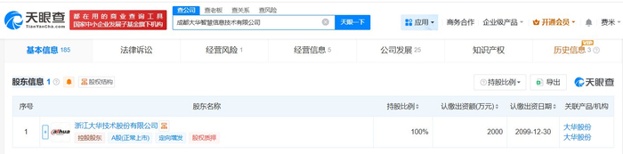 该公司成立于2022年11月,法定代表人为胡华平,注册资本2000万人民币,经营范围包括计算机软硬件及辅助设备零售、计算机软硬件及辅助设备批发、安防设备销售等,由大华股份(002236)全资持股。