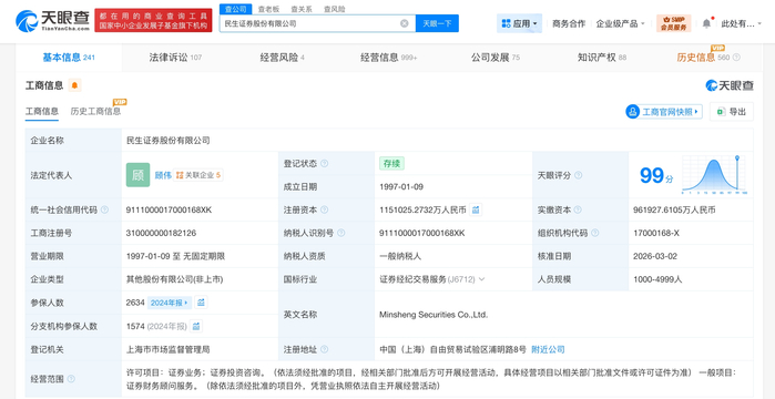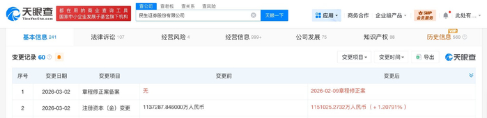 雷达财经讯,天眼查工商信息显示,近日,民生证券股份有限公司发生工商变更,注册资本由约113.7亿人民币增至约115.1亿人民币。