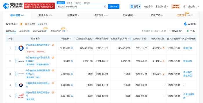 该公司成立于1997年1月,法定代表人为顾伟,经营范围为证券业务、证券投资咨询、证券财务顾问服务。股东信息显示,该公司由中国泛海控股集团有限公司、山东省高新技术创业投资有限公司、山东省鲁信投资控股集团有限公司等共同持股。
