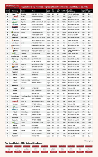 爱旭股份作为效率王者已连续33个月蝉联TaiyangNews全球商用组件量产效率榜榜首,其常规量产ABC组件(2382mm*1134mm标准版型)主流功率655-660W,量产交付效率达到24.6%。