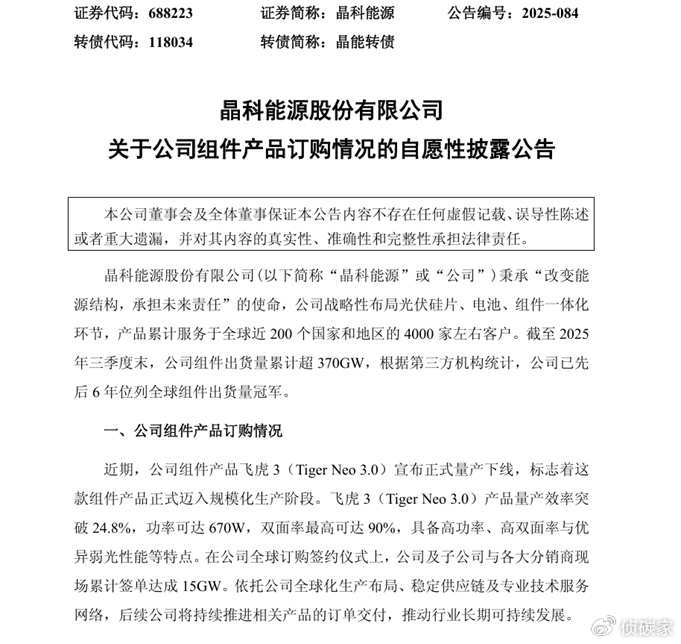据本次公告披露,晶科能源飞虎3(TigerNeo3.0)产品量产效率突破24.8%,功率可达670W,双面率最高可达90%,具备高功率、高双面率与优异弱光性能等特点。在公司全球订购签约仪式上,公司及子公司与各大分销商现场累计签单达成15GW。