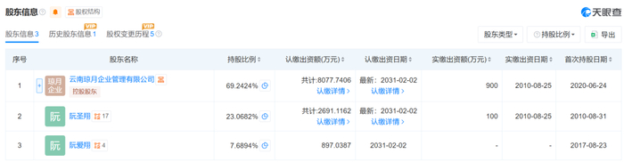 天眼查App显示,圣爱中医集团由刘琼旗下云南琼月控股,阮圣翔、阮爱翔分别持有圣爱中医集团23%、7.6%的股权。
