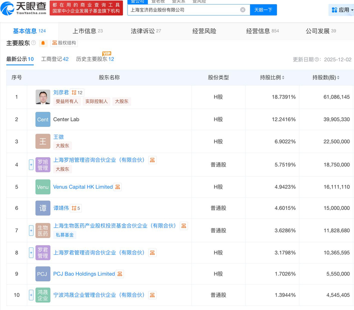 天眼查App信息显示,宝济药业成立于2019年12月,位于上海市宝山区。目前,该公司的注册资本为5761.3953万元,法定代表人为刘彦君,主要股东包括刘彦君、王征、Center Lab等。