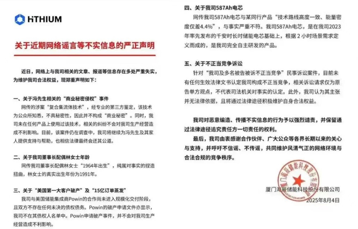 面对宁德时代的指控,海辰储能发布声明称其587Ah电芯属于“完全自主研发”产品,并表示网传涉案的“复合集流体技术”为公众所知悉,不具秘密性,强调宁德时代的不正当竞争诉讼主张无法律依据,将通过法律途径维护自身合法权益。