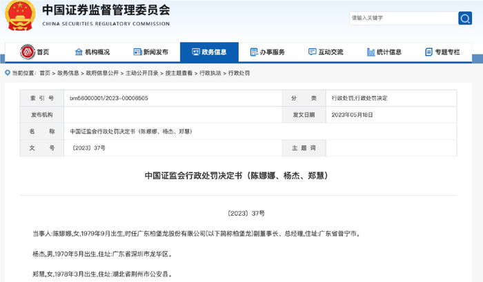 当事人:陈娜娜,女,1979年9月出生,时任广东柏堡龙股份有限公司(以下简称柏堡龙)副董事长、总经理,住址:广东省普宁市。