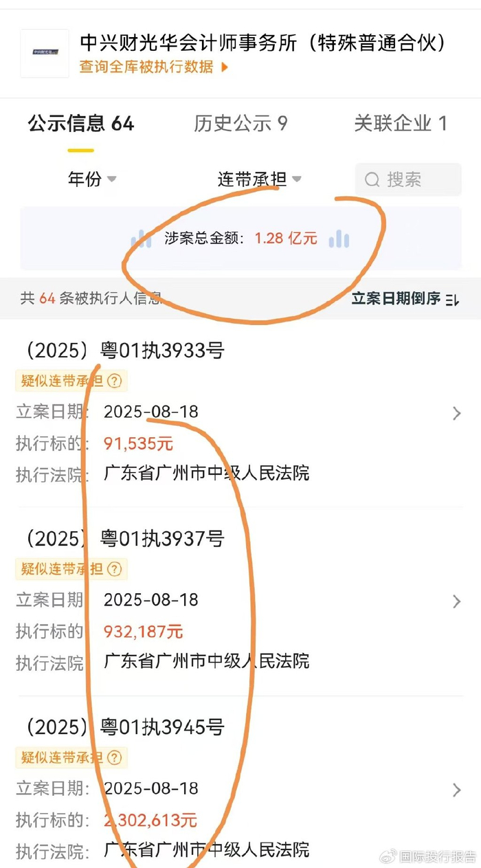 公开的法院信息显示,中兴财光华会计所被广州市中级人民法院法院执行1.2亿多元。