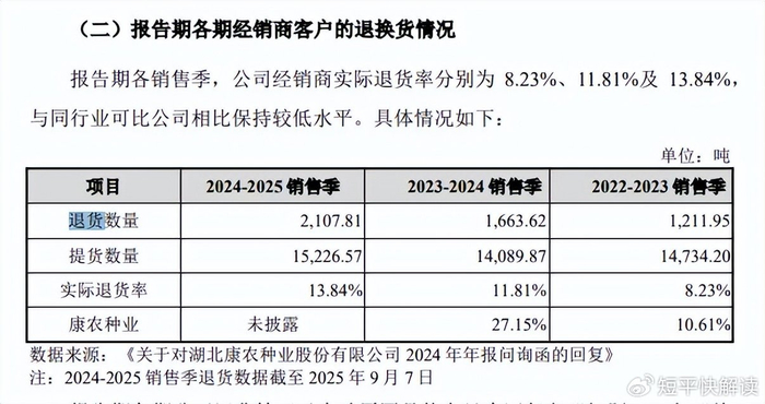 退货数量、退货率双双攀升。报告期内,正大种业退货率有所上升,2022-2023销售季、2023-2024销售季、2024-2025销售季退货数量分别为1,211.95吨、1,663.62吨、2,107.81吨,实际退货率分别为8.23%、11.81%、13.84%。