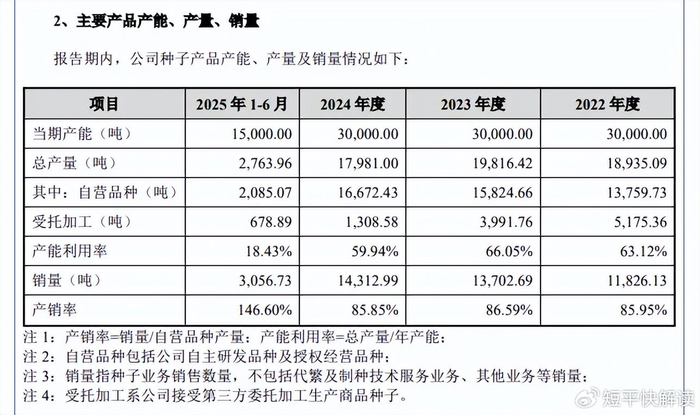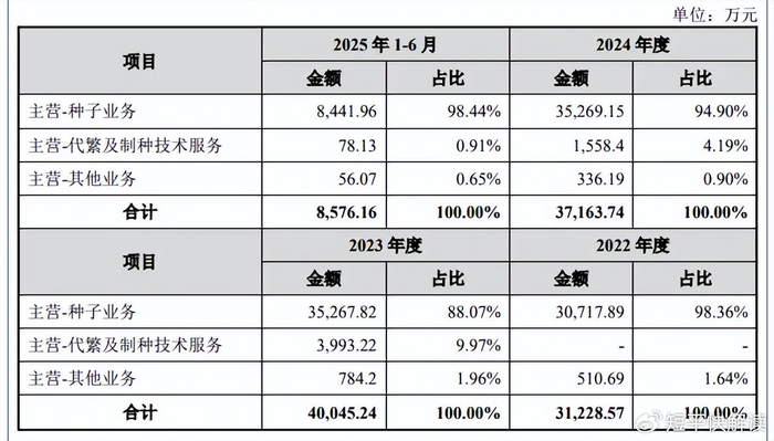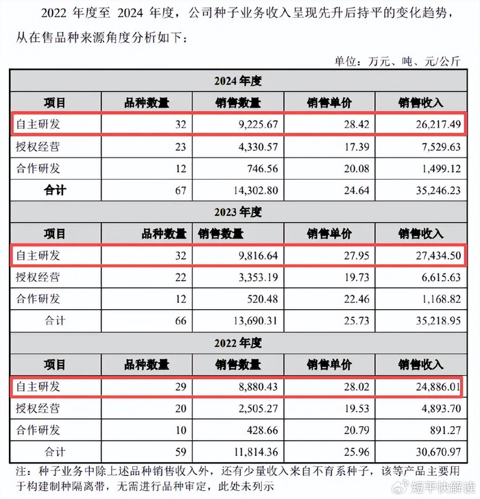 进一步来看,种子业务收入波动与自主研发的品种有关,2022年至2024年销售量分别为8,880.43吨、9,816.64吨、9,225.67吨,销售收入分别为24,886.01万元、27,434.50万元、26,217.49万元,2024年同比下滑4.44%。