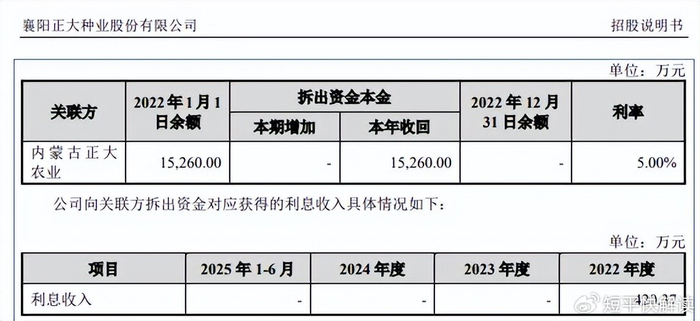 曾拆出资金1.526亿元。报告期内,正大种业存在资金拆出,2022年初对内蒙古正大农业有限公司(内蒙古正大农业)拆出余额为15,260万元,当期偿还完毕,以5%利率计算,获得利息收入420.37万元。