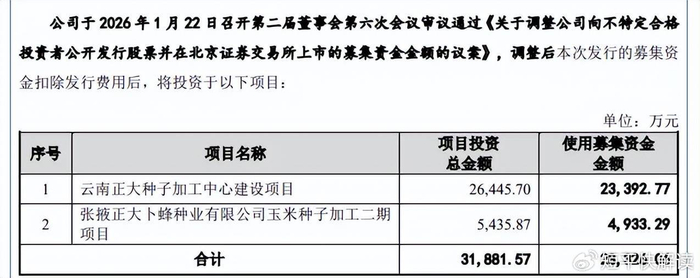 募资缩水超8000万元,删减一项目。本次IPO,正大种业拟公开发行不超过4,804.95万股,拟募集资金28,326.06万元,用于云南正大种子加工中心建设项目、张掖正大卜蜂种业有限公司玉米种子加工二期项目,拟使用募集资金分别为23,392.77万元、4,933.29万元。