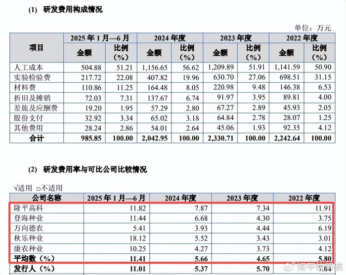 对比行业,可比同行研发费用率均值分别为5.8%、4.65%、5.66%、11.41%,2024年及2025年1-6月,3家同行研发费用率要高于公司,以2024年为例,隆平高科、登海种业、秋乐种业分别为7.87%、6.68%、5.52%,万向德农、康农种业落后于公司,分别为3.93%、4.27%。
