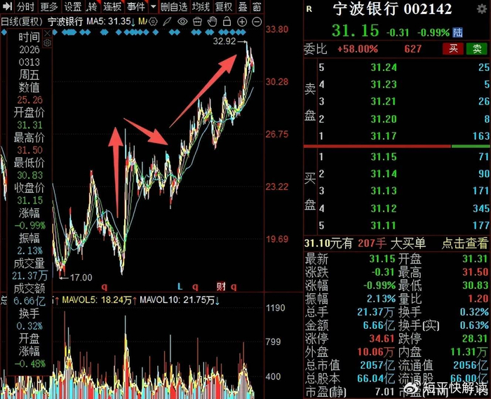 二级市场上,宁波银行表现总体表现尚可,从2024年9月17.15元/股(前复权,下同)的低点,波浪式上升至32.92元/股的高点,截至3月13日收盘,股价为31.15元/股,较低点涨幅约82%,较高点跌幅约5%,总市值2057亿元,TTM市盈率7.13倍。