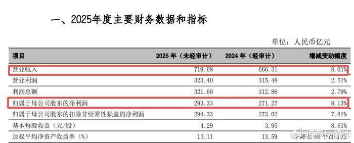 业绩快报显示,2025年实现营业收入、归母净利润分别为719.68亿元、293.33亿元,同比分别增长8.01%、8.13%,宁波银行表示,公司持续提升专业化、综合化服务能力,聚焦实体经济客户需求,不断升级商业模式,各业务板块协同发力,推动经营业绩实现稳健增长,可持续发展的基础进一步夯实。