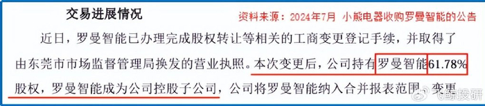 2024年7月,小熊电器以1.54亿现金收购了广东东罗曼智能61.78%的股权,成为了其控股股东。