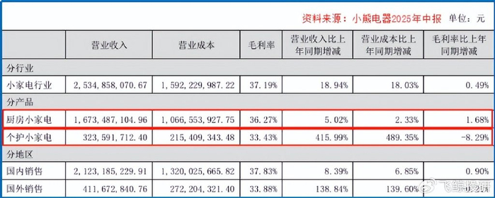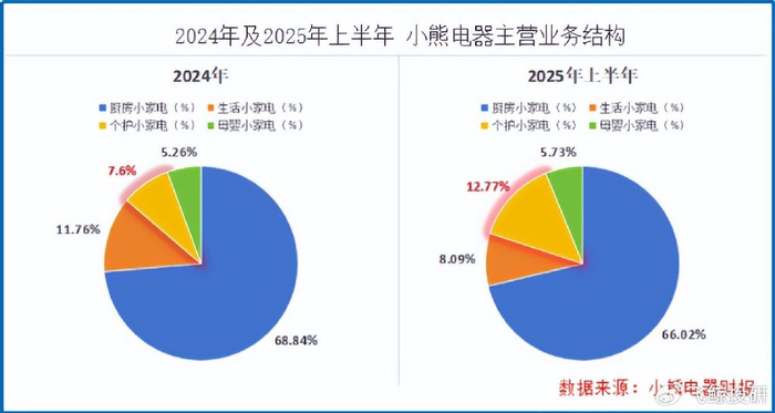 效果立竿见影。2024年,个护业务在小熊营收中占比只有7.6%;到了2025年上半年,已迅速涨到12.77%,成为公司第二大业务。