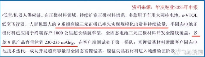 目前,华友钴业多款9系超高镍产品容量已达230-235 mAh/g,并在车用大圆柱电池、e-VTOL低空飞行器、人形机器人等领域率先实现规模化出货。