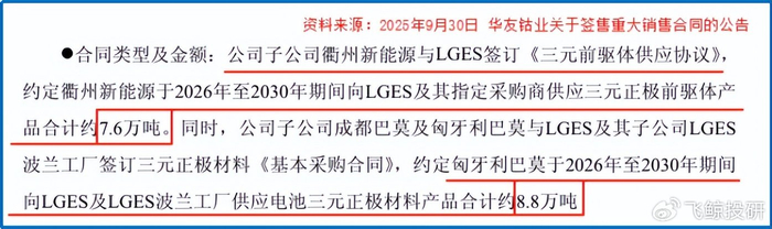 早在今年9月30日,华友钴业就公告与LG新能源签署长期供货合同,约定在2026年至2030年间,为其供应三元前驱体约7.6万吨、电池三元正极材料约8.8万吨。