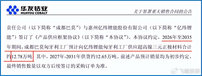子公司成都巴莫与亿纬锂能签订了长期协议,约定在2026-2035年期间向亿纬锂能供应超高镍三元正极材料约12.78万吨。其中,仅2027-2031年就供货约12.65万吨。
