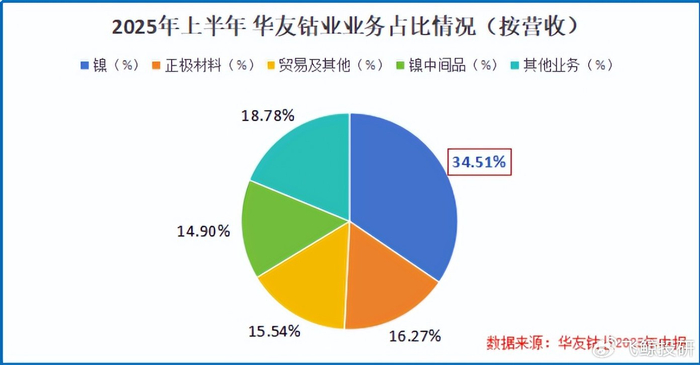 成果迅速反映在财报中。2025年上半年,公司镍产品营收达128.37亿元,占总营收比例升至34.51%,成为公司最主要的收入来源;而钴产品营收仅为12.37亿元,占比降至3.33%。