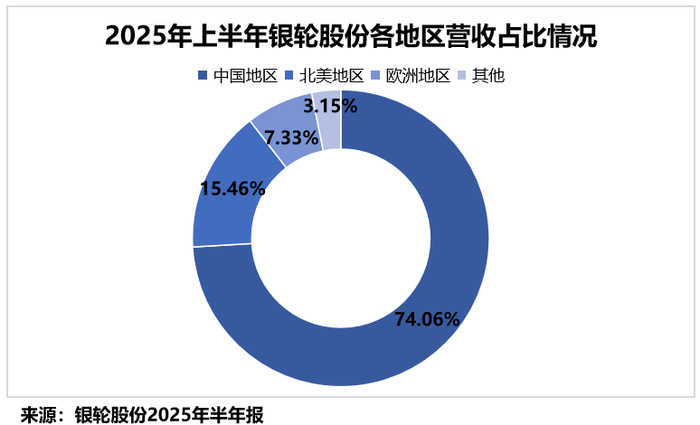2025年上半年,公司在国内实现营收53.08亿元,占总营收的74.06%;在北美和欧洲地区分别实现11.08亿元和5.26亿元,合计占总营收的22.79%。