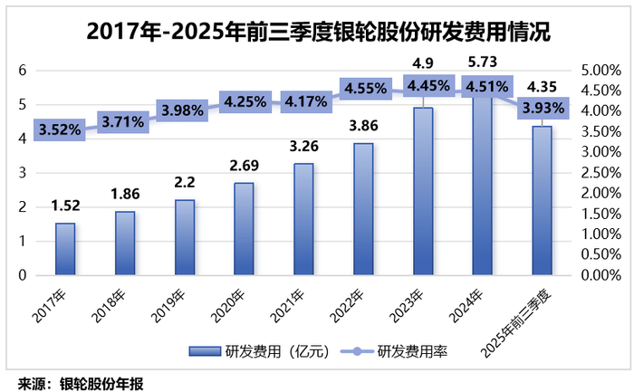 数据显示,2017-2025年前三季度,公司累计投入研发费用超30亿元,研发费用率也维持在4%左右的水平。