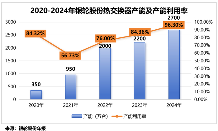 生产基地全球化布局的背后,是公司产能规模的快速攀升。2020-2024年,公司热交换器产能从350万台攀升至2700万台,年均复合增长率高达66.5%。