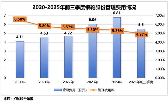 在费用端,2020-2025年前三季度,公司管理费用率从6.5%逐年下降至4.97%,连续多年稳步走低。