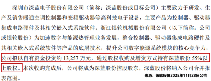 同时,银轮股份还在继续强化在液冷领域的技术能力。2025年11月,公司发布公告拟投资约1.33亿元获取深蓝股份55%以上股权。