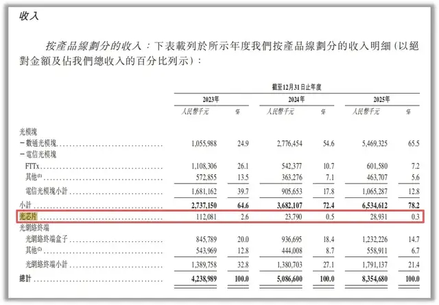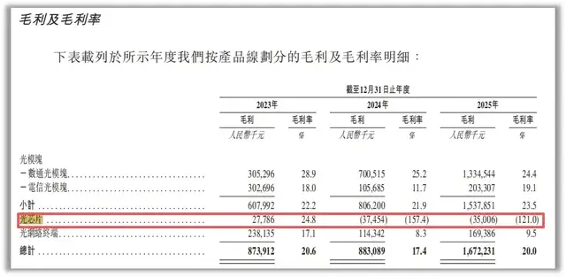 2023年光芯片业务毛利率尚为24.8%,但2024年直接由正转负至-157.4%,产生毛利润-3745万元;2025年仍不能转正,为-121%,录得毛利润-3500.6万元。