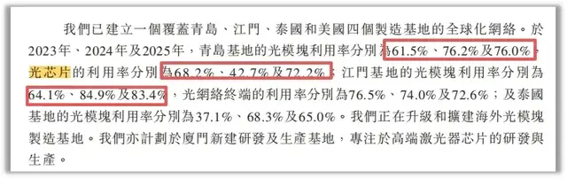 据招股书披露,2023年、2024年及2025年,公司青岛基地的光模块利用率分别为61.5%、76.2%及76.0%,光芯片的利用率分别为68.2%、42.7%及72.2%;江门基地的光模块利用率分别为64.1%、84.9%及83.4%,光网络终端的利用率分别为76.5%、74.0%及72.6%;及泰国基地的光模块利用率分别为37.1%、68.3%及65.0%。