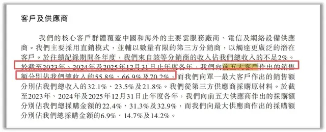 招股书显示,公司前五大客户销售额占比已从2023年的55.8%逐年攀升至2025年的70.2%,客户集中度风险高企。