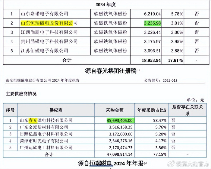 权衡财经iqhcj较注意的是,公司客户山东恒瑞磁电股份有限公司,其为新三板上市企业873941简称恒瑞磁电,据其新三板年报显示,除2024年度外,其他年度披露的交易额与春光集团的披露较为接近,有所区别的是2024年度的采销有所不一。春光集团的注册稿显示,2024年向第二大客户恒瑞磁电销售了3235.98万元,而同期恒瑞磁电新三板年报披露,其向第一大供应商春光集团采购了3569.34万元,相差达333.36万元,占春光集团披露额度的10.3%之多,或难相符。