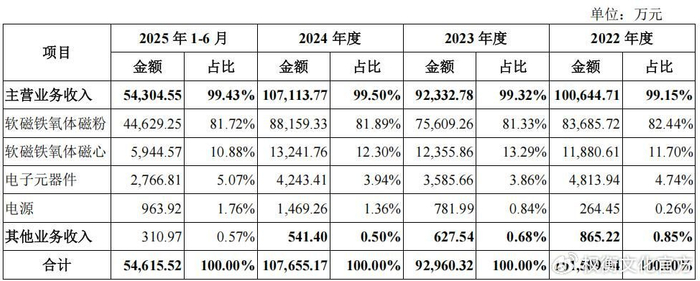 春光集团目前主要聚焦于软磁材料中的铁氧体技术路线,产品以磁粉和磁心为主,应用于新能源汽车、光伏储能、通信设备、电源系统等多个场景。其中,收入的主要来源为软磁铁氧体磁粉,报告期内,公司软磁铁氧体磁粉产品收入分别为8.369亿元、7.561亿元、8.816亿元和4.463亿元,占各期营业收入比例分别为82.44%、81.33%、81.89%和81.72%。