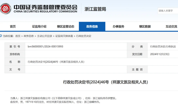 中国证监会2024年12月的行政处罚决定书[2024]46号显示: