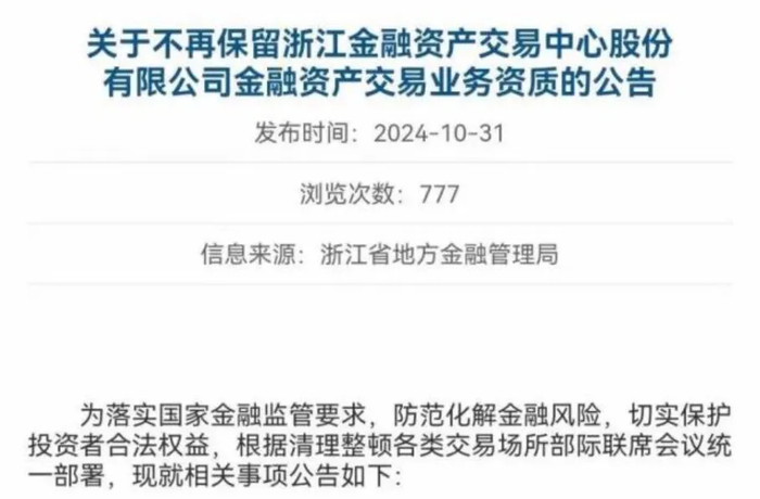 但是,事情在2024年10月份就变了。浙江省地方金融管理局发布公告,明确不再保留浙金中心的金融资产交易业务资质,仅要求其承担存量业务处置责任,不再发布新产品,但存量产品仍可转让和买入。