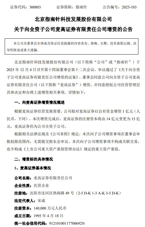 12月4日,北京指南针科技发展股份有限公司(简称:指南针)召开第十四届董事会第十二次会议,审议通过了《关于向全资子公司麦高证券有限责任公司增资的议案》,董事会同意公司以自有资金向全资子公司麦高证券有限责任公司(简称:麦高证券)增资1亿元人民币。本次增资完成后,麦高证券的注册资本将由14亿元变更为15亿元。