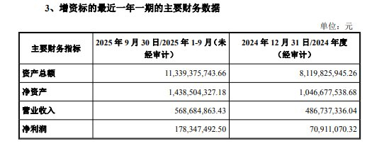公告中同时披露了麦高证券最近一年一期经审计的财务数据:2025年前三季度营业收入5.69亿元,相当于2024年全年4.87亿元的116.84%;净利润1.78亿元,相当于2024年全年0.71亿元的251.51%。报告期末总资产113.40亿元,净资产14.39亿元,同样出现了翻倍增长。