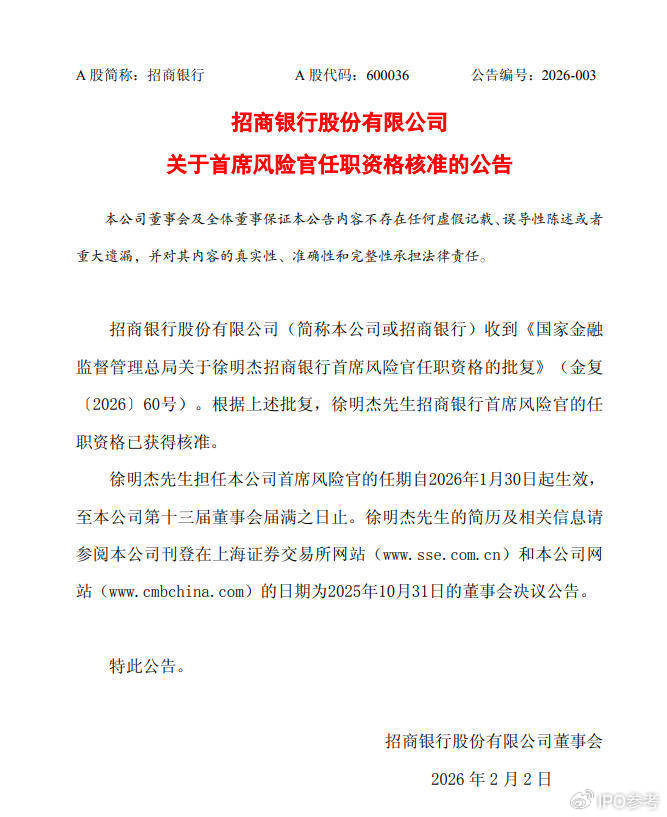 2月2日,招商银行股份有限公司(600036.SH/03968.HK,下称“招商银行”)发布公告称,收到《国家金融监督管理总局关于徐明杰招商银行首席风险官任职资格的批复》。根据上述批复,徐明杰招商银行首席风险官的任职资格已获得核准。徐明杰担任该行首席风险官的任期自2026年1月30日起生效,至该行第十三届董事会届满之日止。