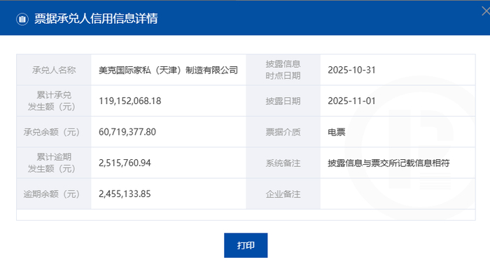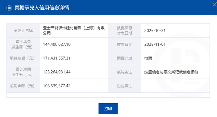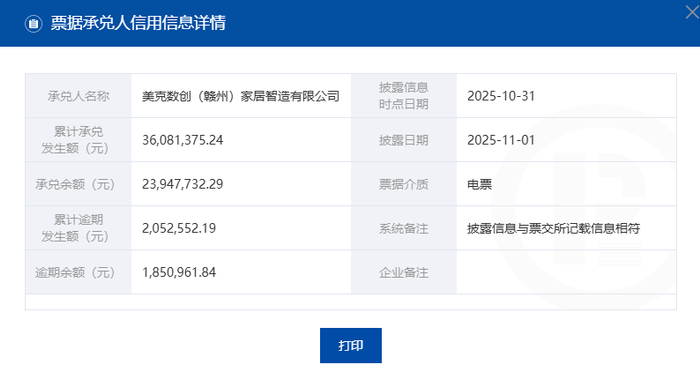 A股上市公司方面,据快查、同花顺iFinD数据不完全统计,财闻发现10月新出现在《承兑人逾期名单》中的公司,涉及A股公司的有21家,截至10月末仍有逾期余额的有天宜新材(688033.SH)、永太科技(002326.SZ)、美克家居(600337.SH)、科陆电子(002121.SZ)等的上市主体或子公司。
