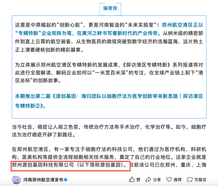 从公开资料看,源创基因据称在细胞疗法等方面具备领先实力。据郑州航空港经济综合实验区管理委员会官方账号,源创基因曾作为郑州航空港区专精特新的发展成果重点介绍。